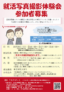 就活写真スタジオ撮影体験会を実施します 2017年10月25日 平成29年10月29日(日)にラヴィ・ファクトリー仙台店にて、就活写真スタジオ撮影体験会を実施します。 当日はヘアメイク~撮影・レタッチ(修正)までを実際に代表者1名の方に体験していただき、他の参加者の方はその様子を見学していただきます。 体験会は今回限りの開催となります。 ご参加いただいた方全員に『スタジオ撮影料金50%オフ』の参加特典をもれなくプレゼントしますので、東北学院大学生の皆様はぜひご参加ください。 « 前のページ 次のページ »